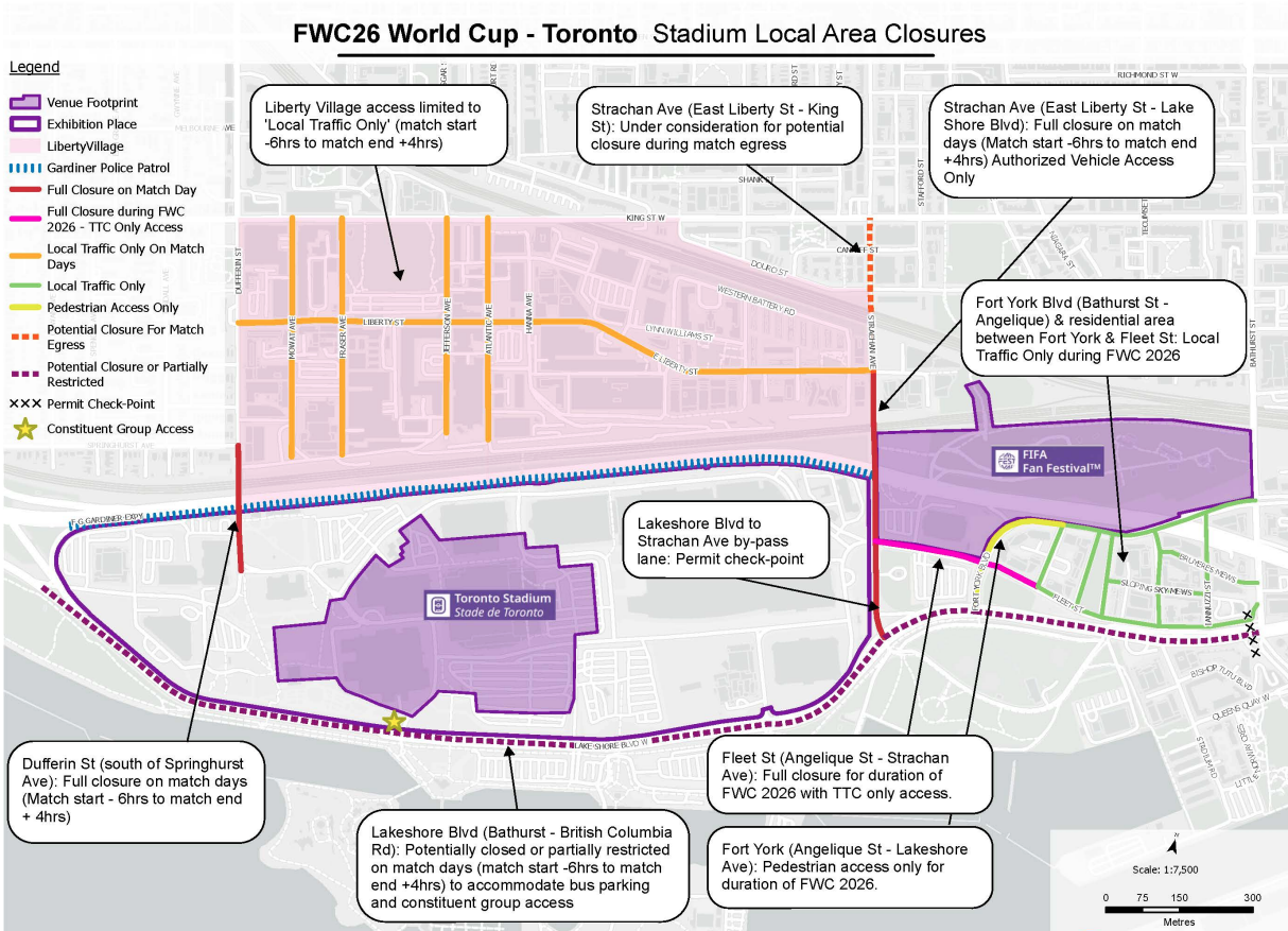 On each of Toronto’s six match days and the day before, expect significant road closures and transit disruptions around Exhibition Place. The streets most likely to be affected: