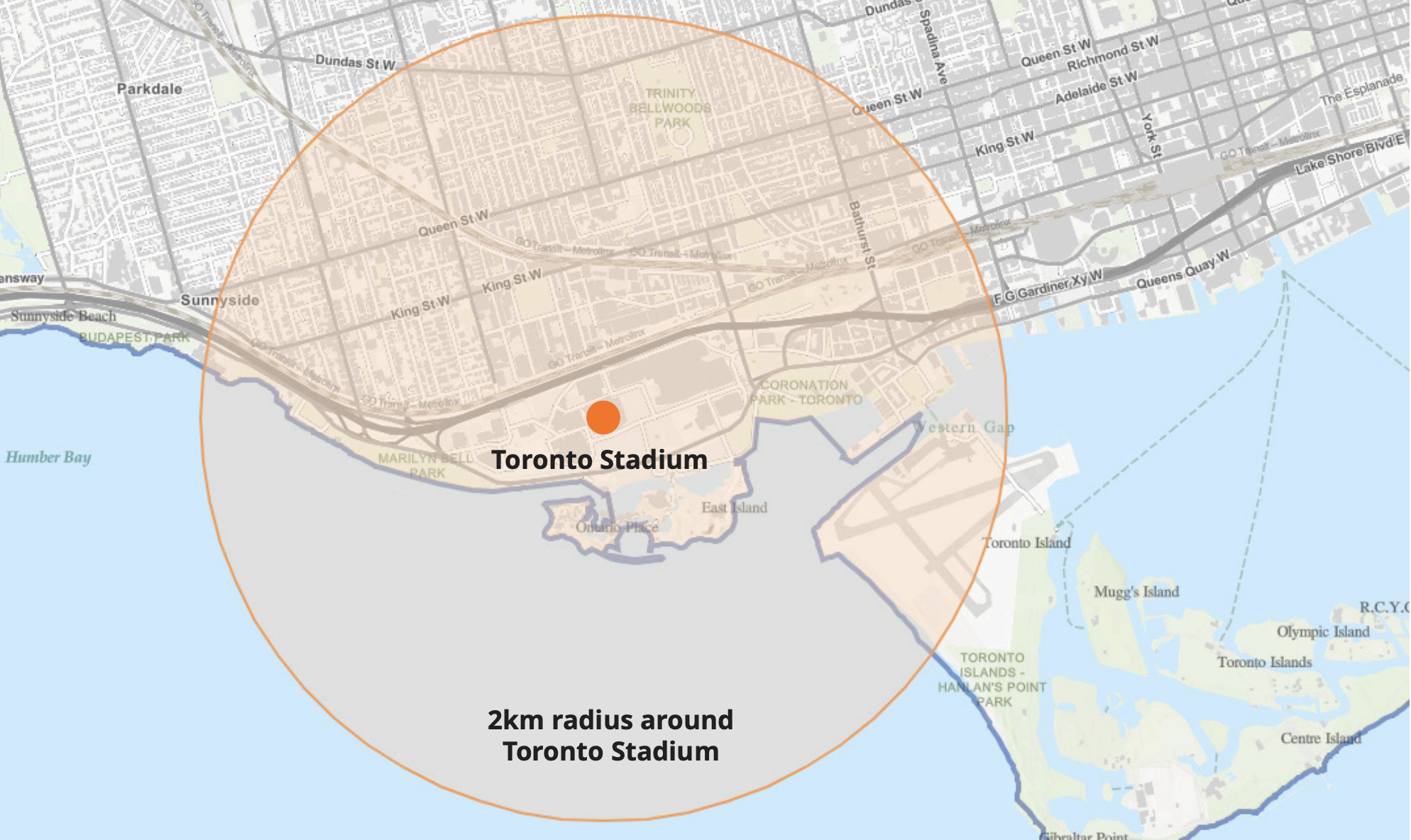 Toronto Stadium at Exhibition Place: A 2-kilometre radius, active on each match day and the day before