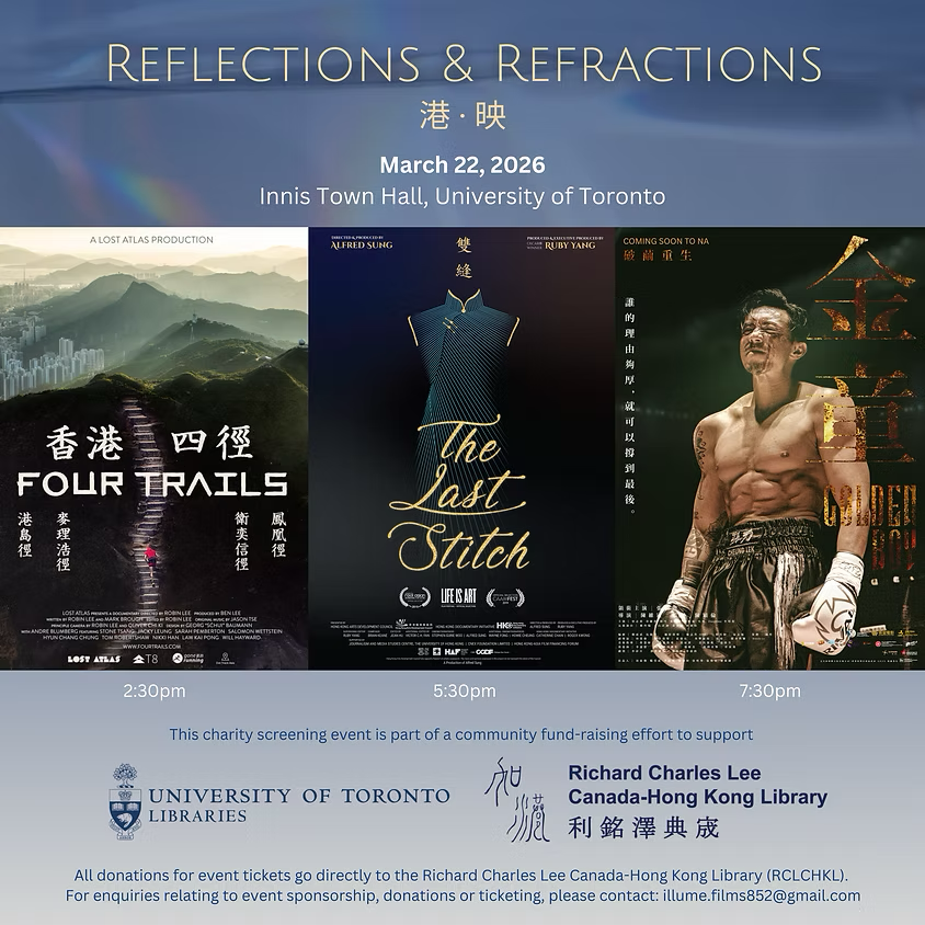 On March 22, 2026, we were honoured to partner with Illume Films 852 to support Reflections & Refractions 港·映 — a charity screening day held at Innis Town Hall, University of Toronto, raising funds for the Richard Charles Lee Canada-Hong Kong Library, one of the most significant collections of Hong Kong cultural heritage outside of Asia.